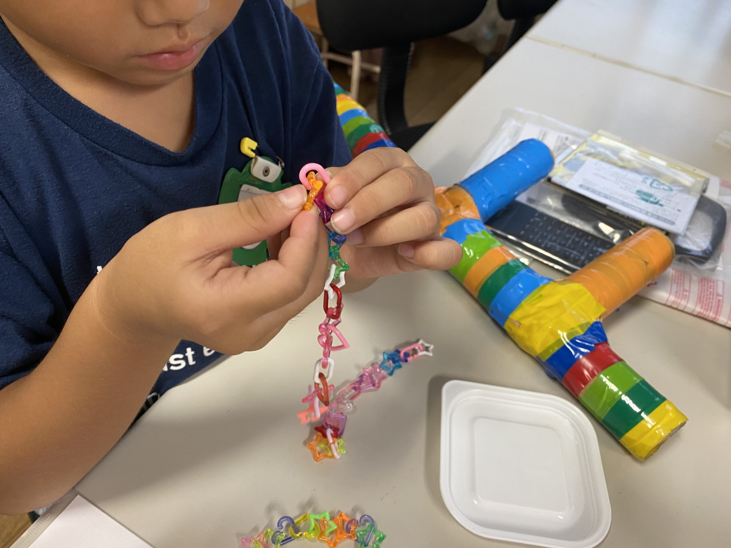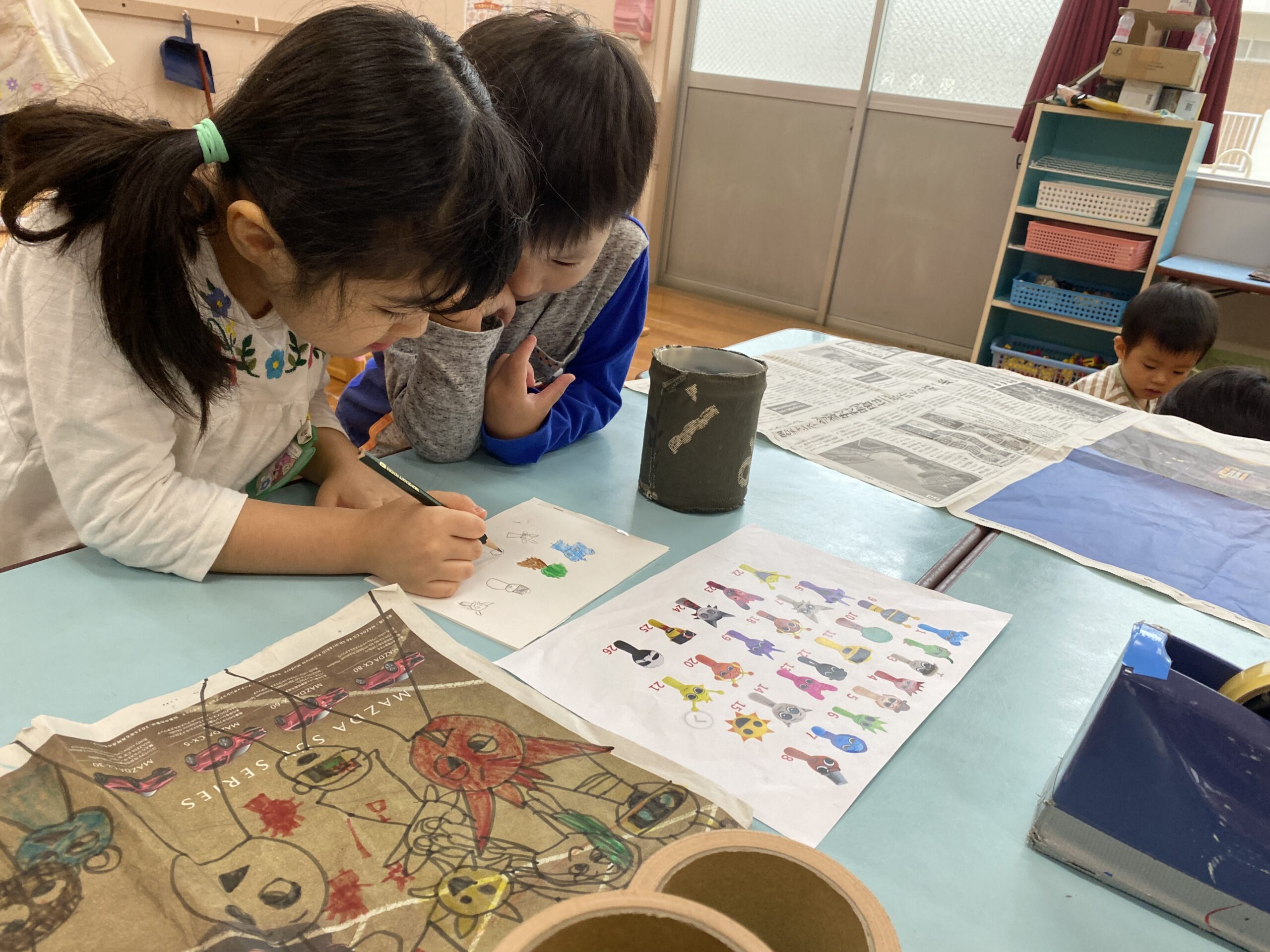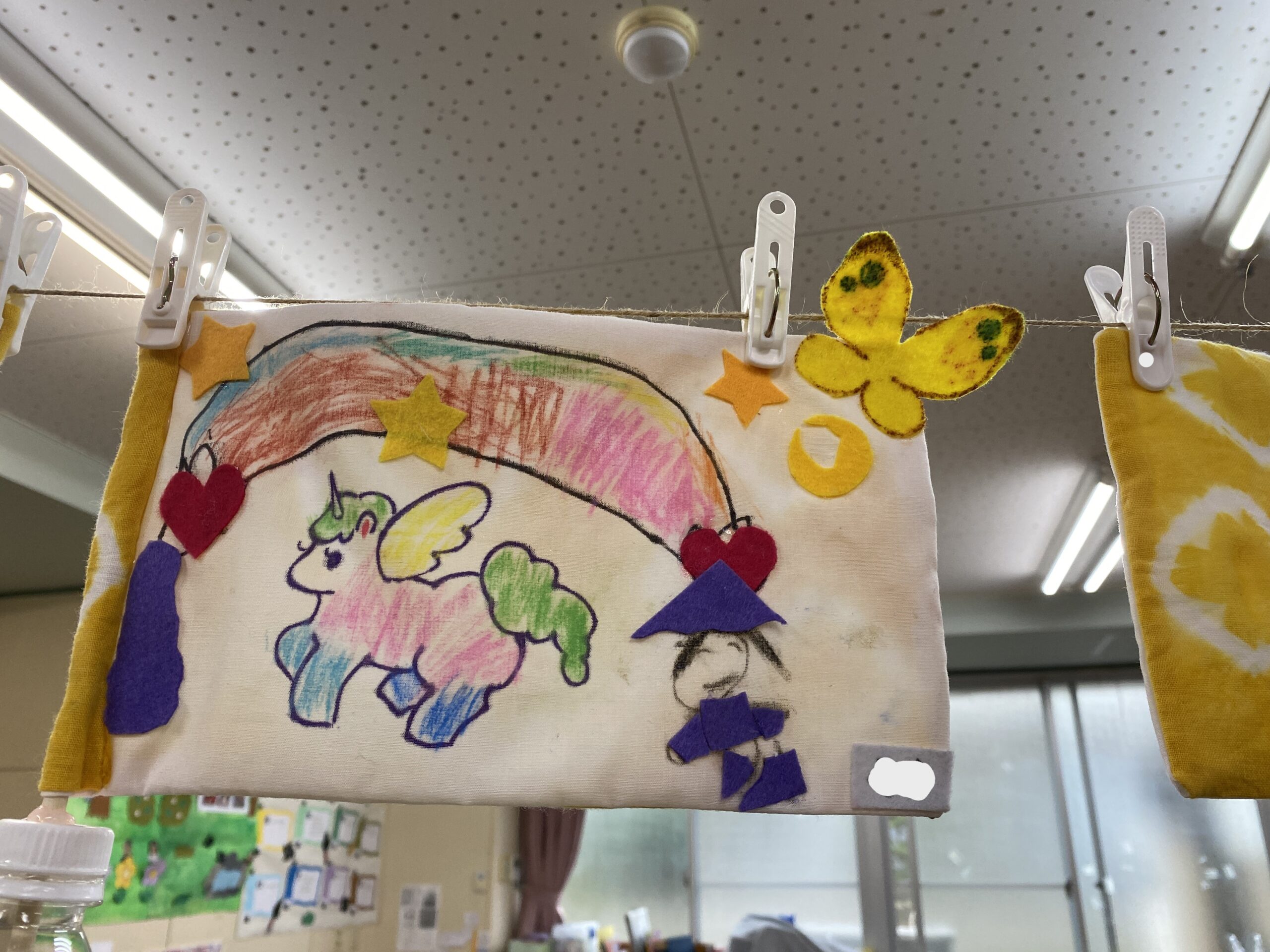 - 染めたフラッグに 親子で装飾を施しました。プレイデーに持ち歩く場面があるかもしれません。