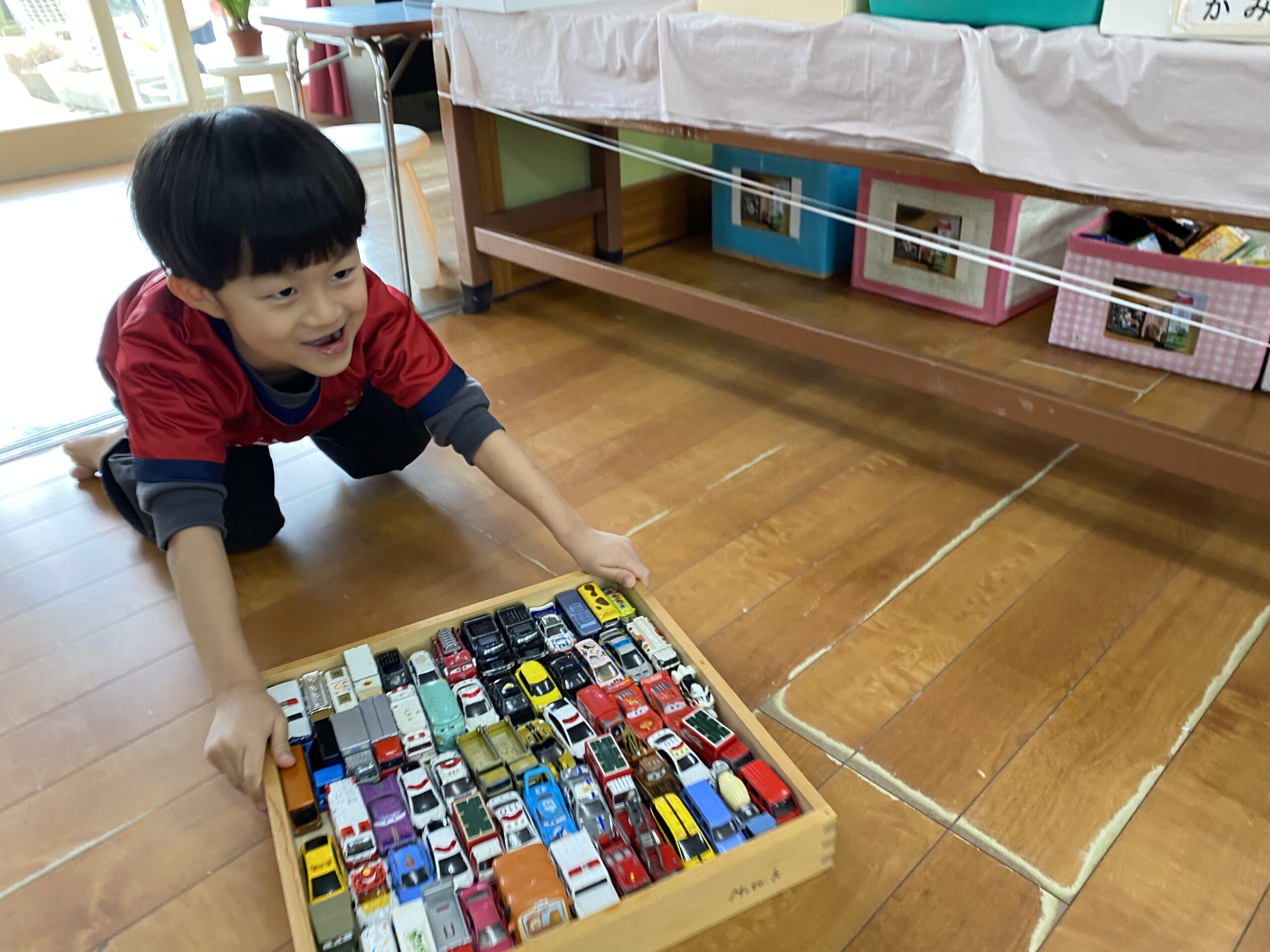 - 積み木の箱に ぴったりはまっているのは 使い込まれたミニカー。平面で見ると こんなにあったんだとよくわかりました。