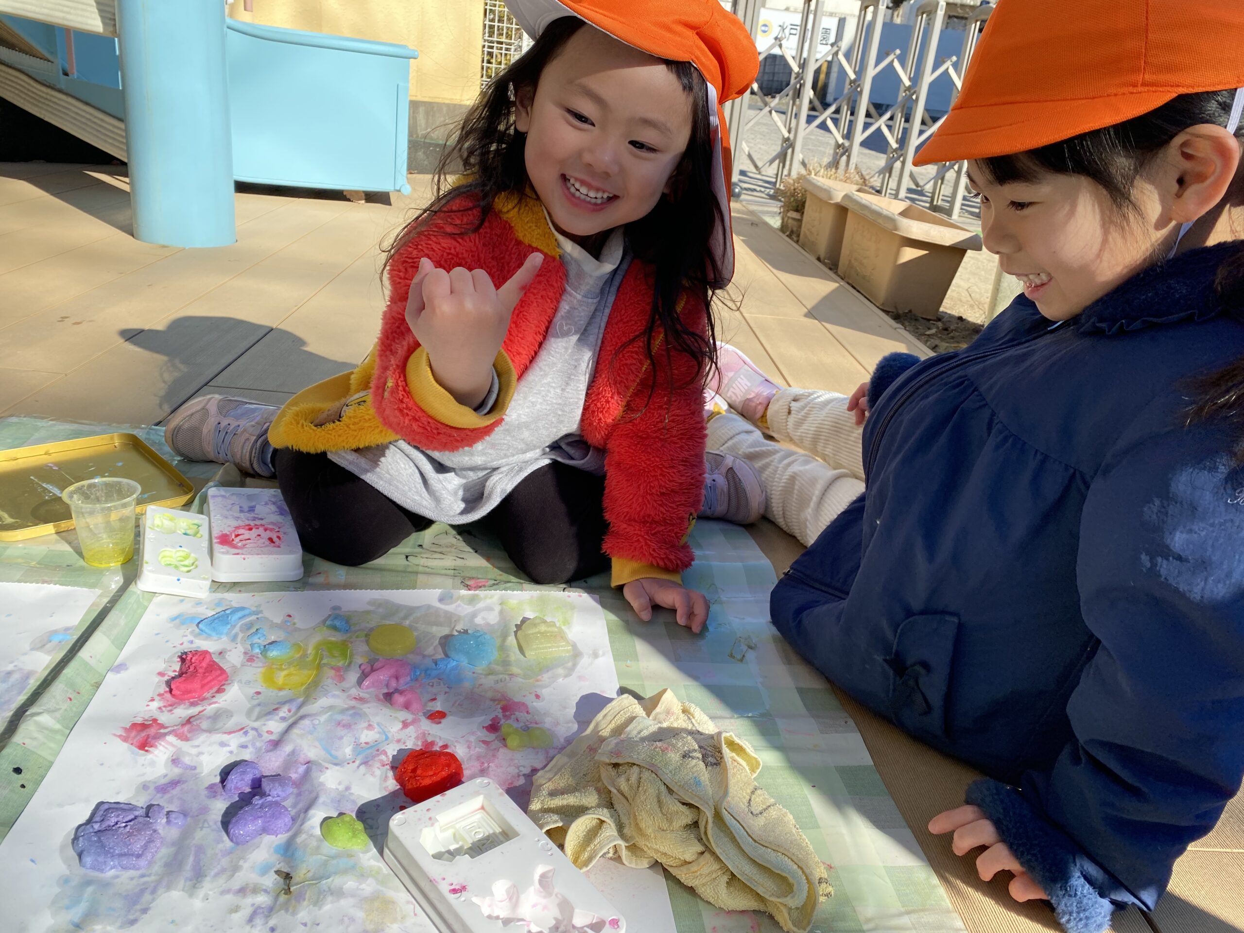 - 絵具入りの水を型に入れて凍らせて 翌日スタンピングしてみました!ゆびさき つめたい!