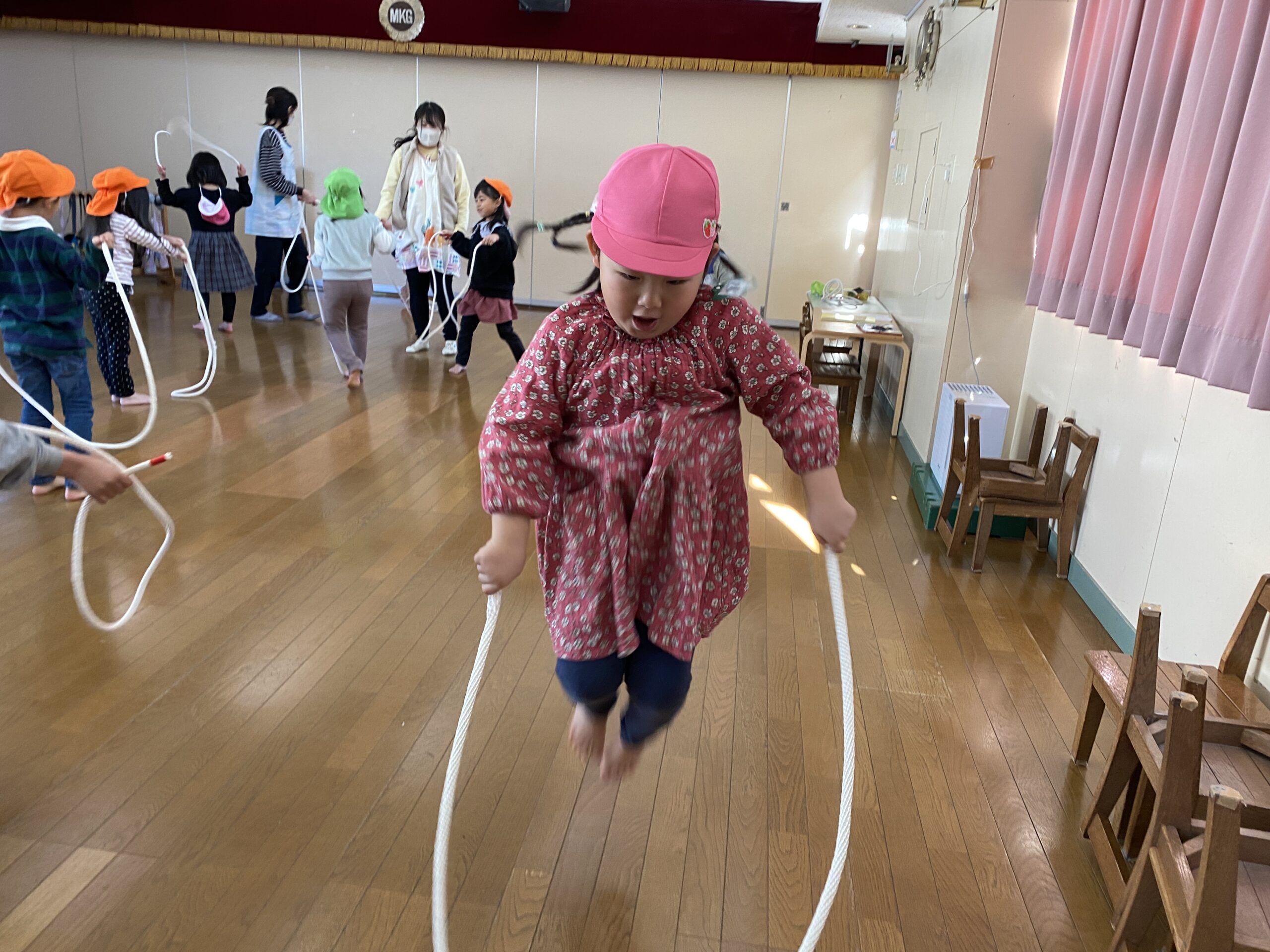 - 運動スタッフが太めの 縄 をもってきてくれました。まさに 縄跳び!