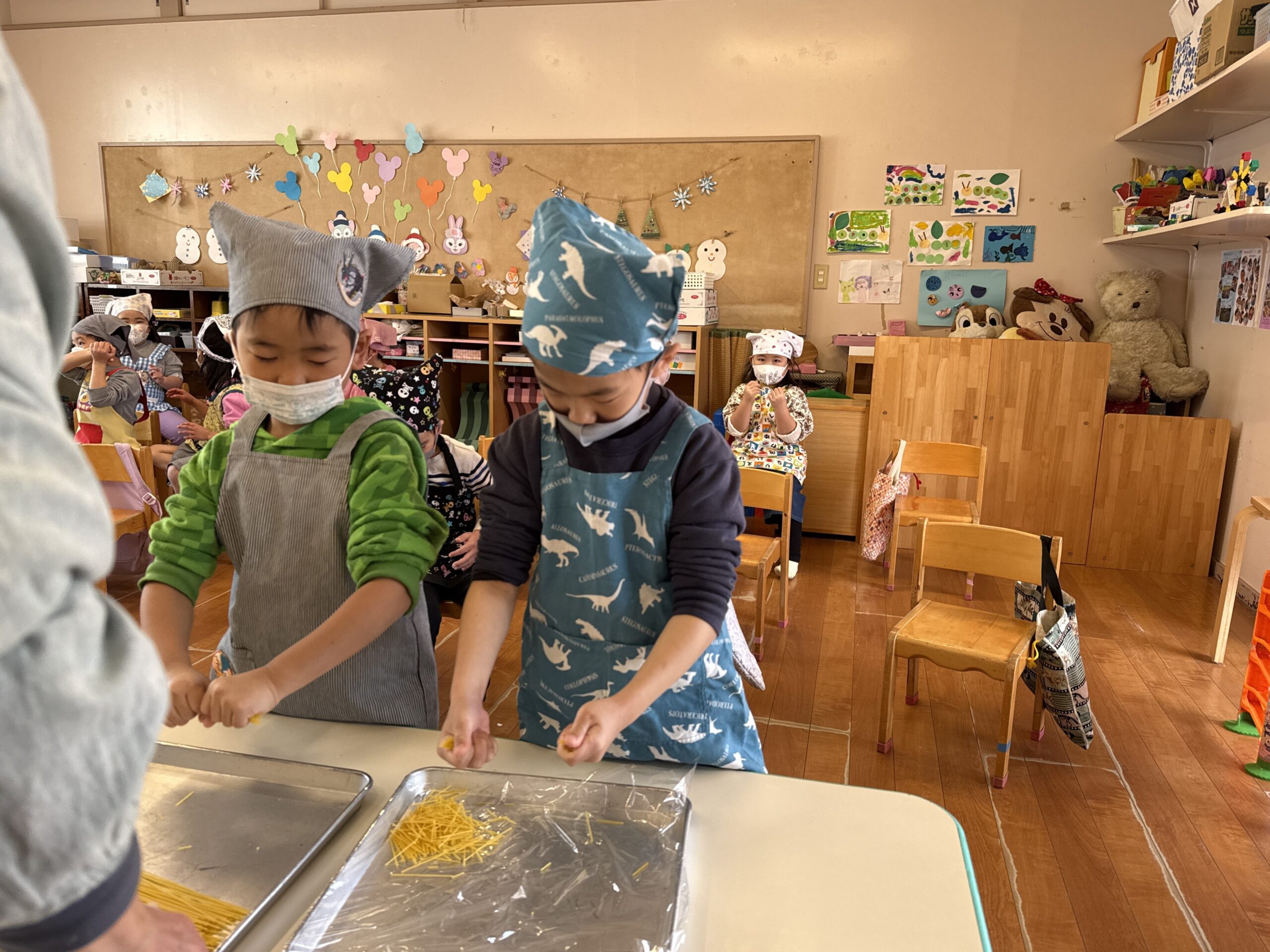- 年長さん最後のクッキング。給食のフライやパスタサラダのお手伝い。