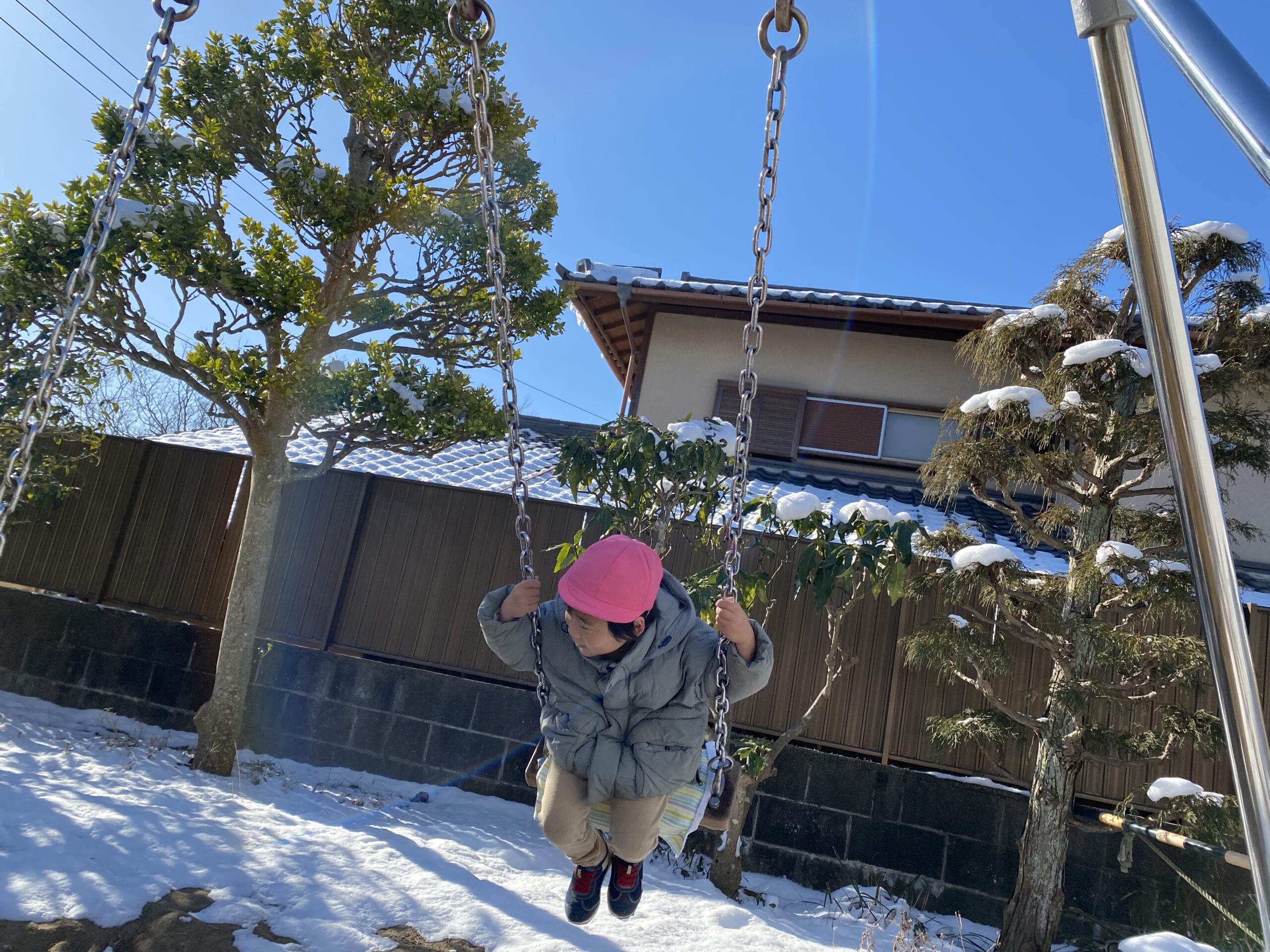 - 日曜日にいっぱい降ったようで あっという間に消えてしまった雪たち。ブランコが雪で凍っていて タオルを敷いて乗っています。