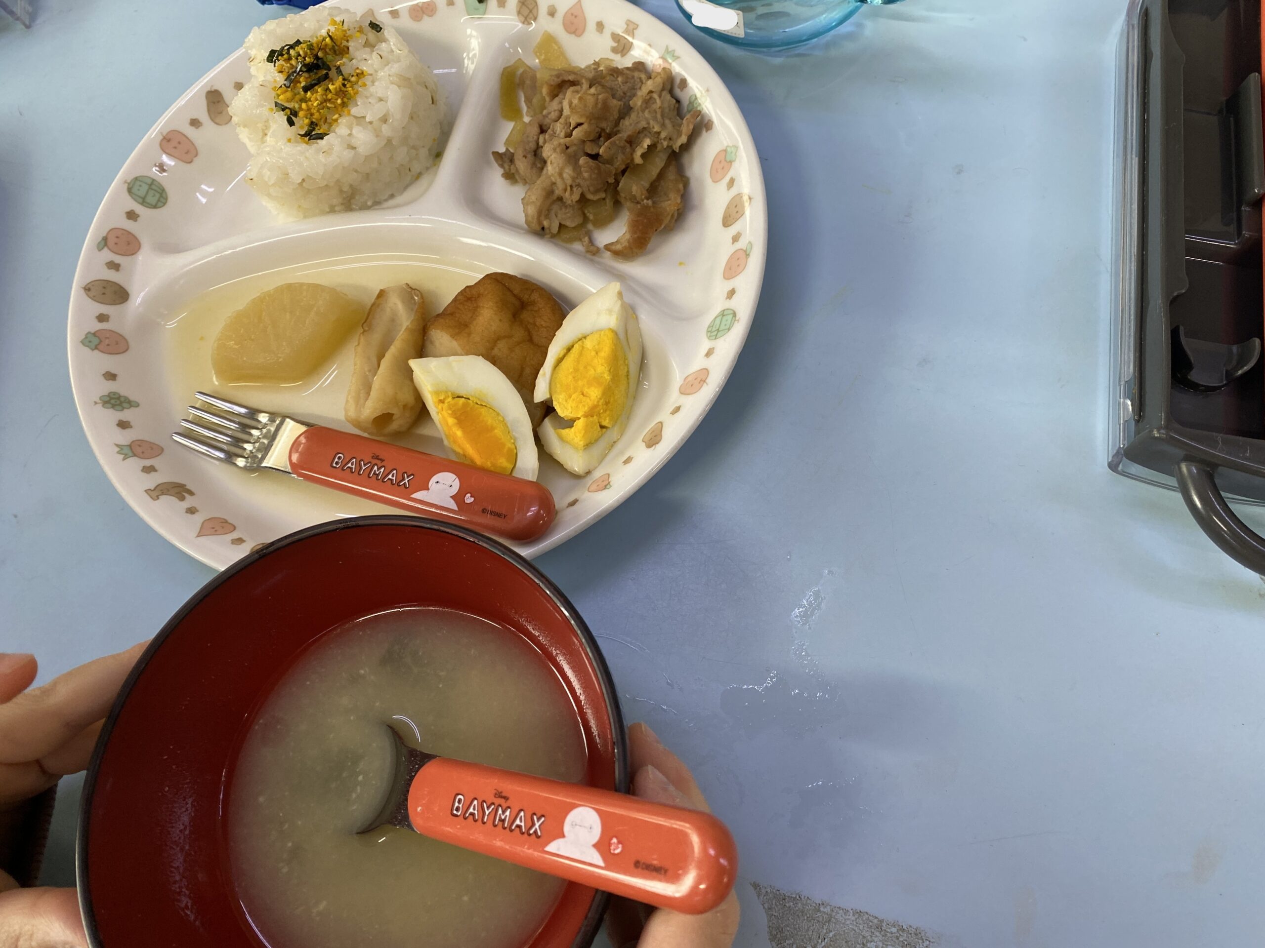 - おでん風煮込みに 生姜焼き 地元のお米に 出しのきいたお味噌汁。