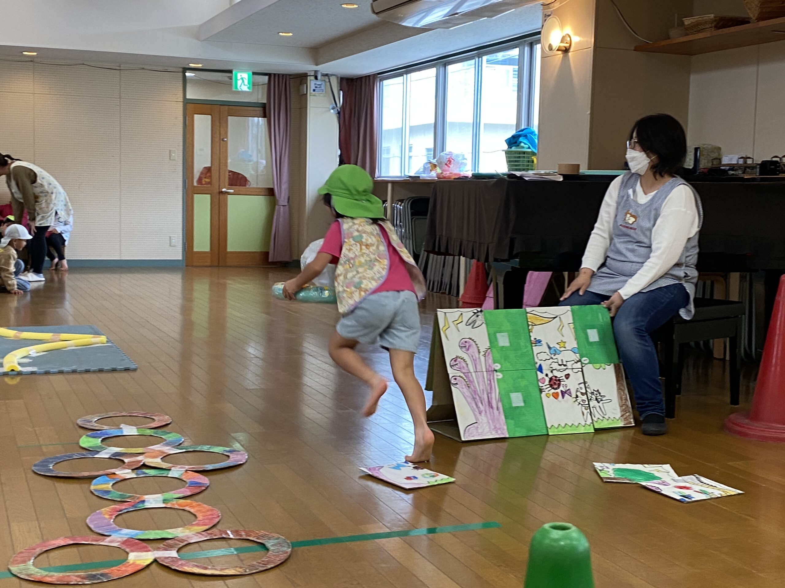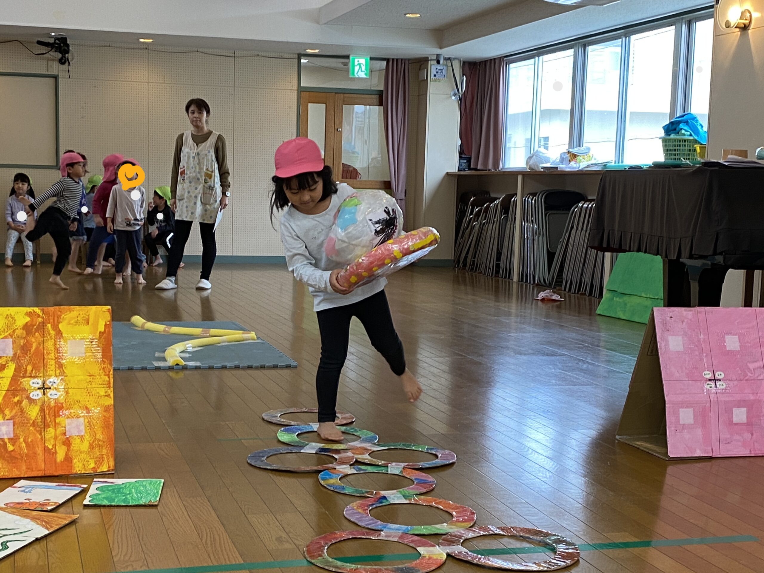 - プレイデーで行う、子どもたちが話し合って決めた 卵運び。恐竜の卵だそうです。