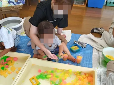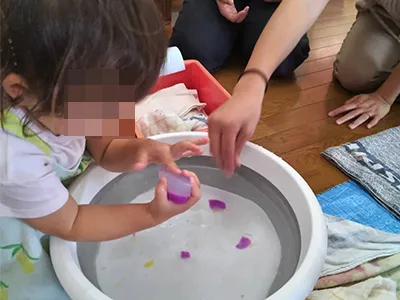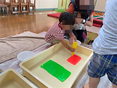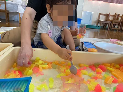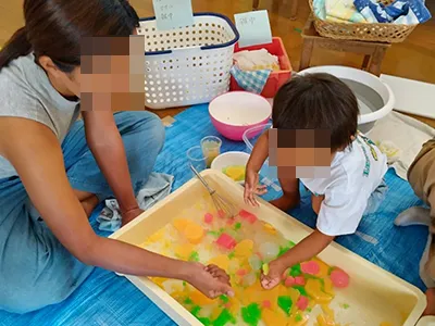 平らな寒天、丸い寒天、色とりどりの寒天。色んなタイプを用意してみました。切ったりこねたり、容器に沢山集めてみたり、それぞれの感性で遊びました。